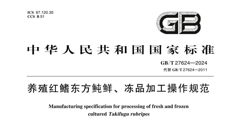 國家標(biāo)準(zhǔn)GB/T27624-2024《養(yǎng)殖紅鰭東方鲀鮮、凍品加工操作規(guī)范》正式發(fā)布